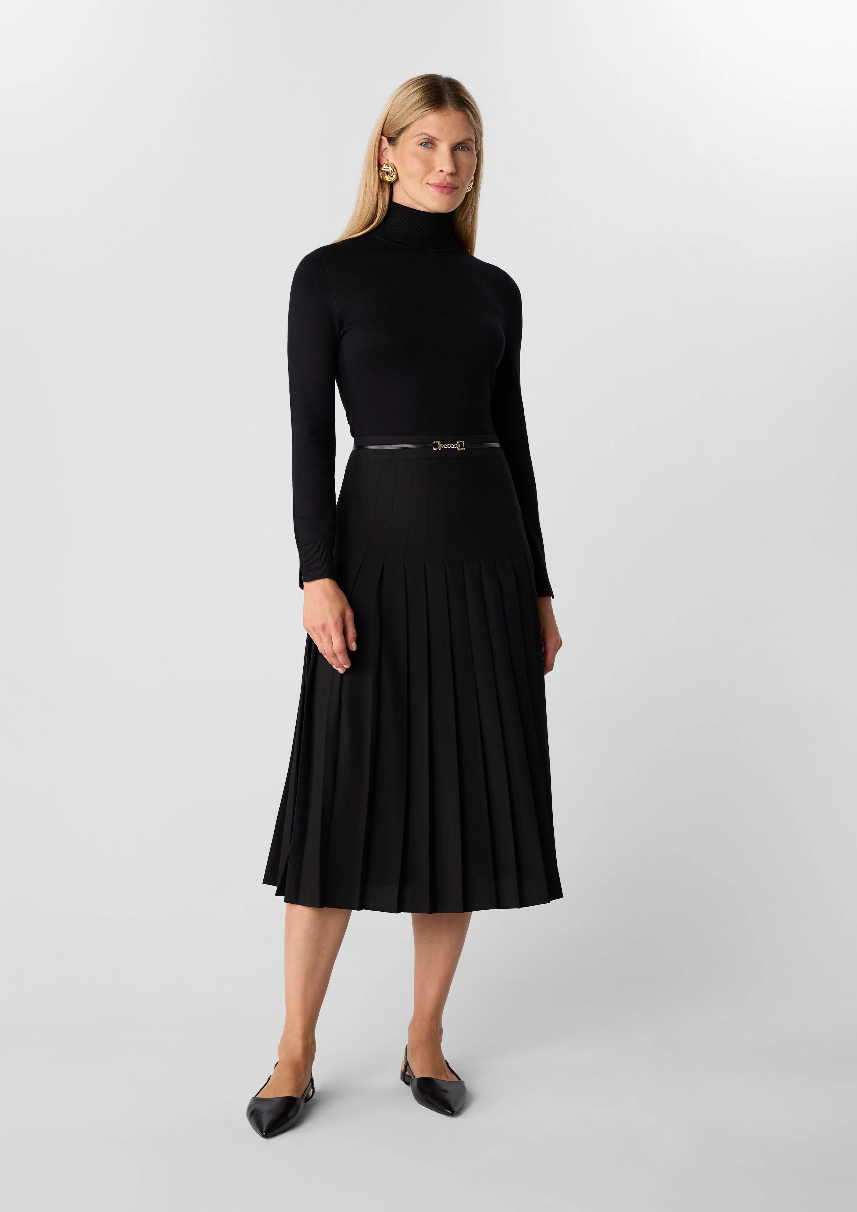DetailsElevate your style with this midi pleated skirt featuring a high neckline and decorative detail. Its hidden zip closure ensures a sleek silhouette, while the pleats add a touch of sophistication. Perfect for both office and evening wear, you'll love how versatile this piece is. Pair with a silk blouse for a polished look or dress it down with a casual tee for effortless chic.Fastener:concealed zipDetails:pleatEAN: 4099591149843Article number: 2170729.9999.44